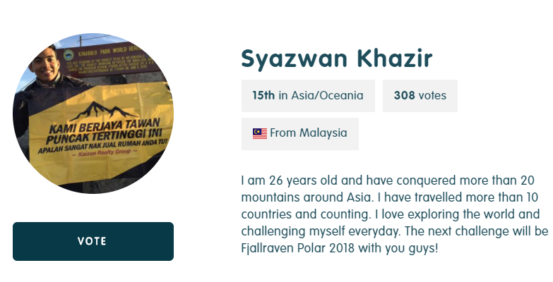 Jadi ayuh rakyat Malaysia jangan berlengah lagi untuk mengundi Syazwan menerusi pautan berikut iaitu di http://polar.fjallraven.com/contestant/?id=3542