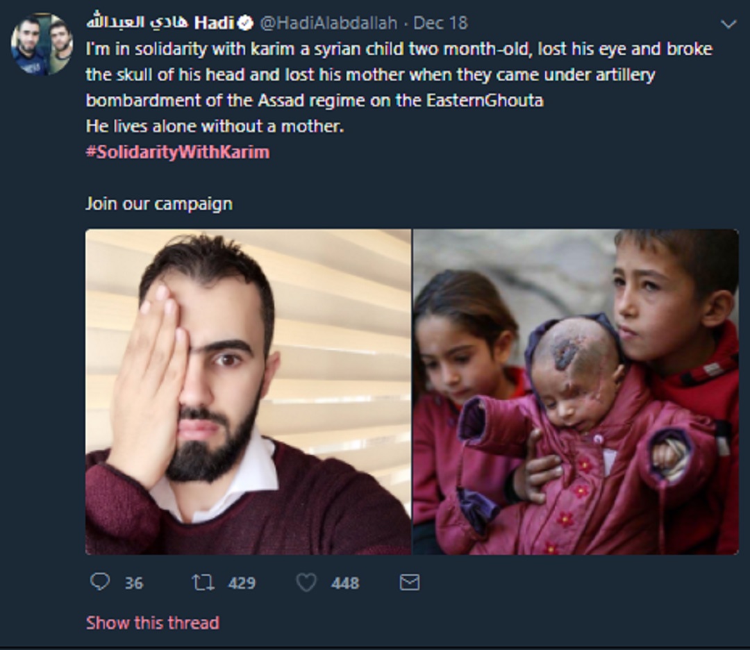 “Kanak-kanak Syria bersolidariti dengan Karim, yang kehilangan satu mata dan retak kepala selepas dibom rejim Assad di timur Ghouta. Ibunya juga maut dalam serangan sama,” ujarnya dalam salah satu posting di laman Twitter miliknya.