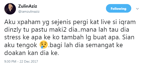 Melalui status di akaun Twitternya baru-baru ini, Zulin dilihat terkilan dengan tindakan netizen yang mencaci Iqram.