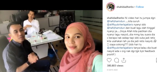 Sementara itu, menerusi Instagram isteri Aliff iaitu Datin Seri Nur Shahida Mohd Rashid ada memuat naik rakaman menunjukkan Aliff mengadakan pertemuan dengan penyanyi dan komposer, Hafiz Hamidun.
