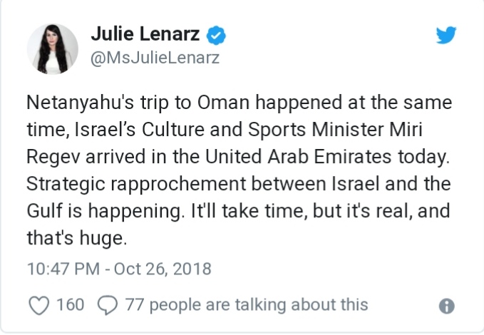 Strategi berbaik dengan negara-negara Arab ini diusahakan secara aktif oleh Netanyahu, yang mahu kerjasama lebih rapat dengan negara-negara Arab untuk bersama menangani Iran dan supaya kewujudan Israel diiktiraf.
