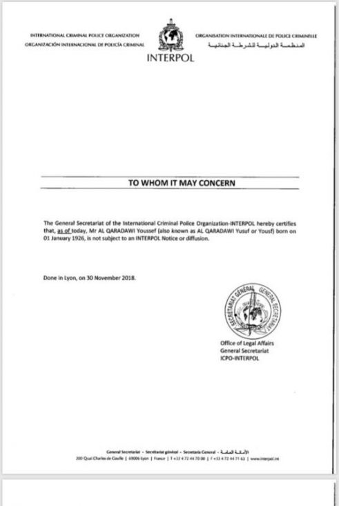Sumber dari pejabat Qaradawi mengesahkan telah menerima pemakluman rasmi dari Interpol memberitahu nama ulama itu sudah dikeluarkan daripada senarai dikehendaki, menyifatkannya sebagai satu langkah positif.