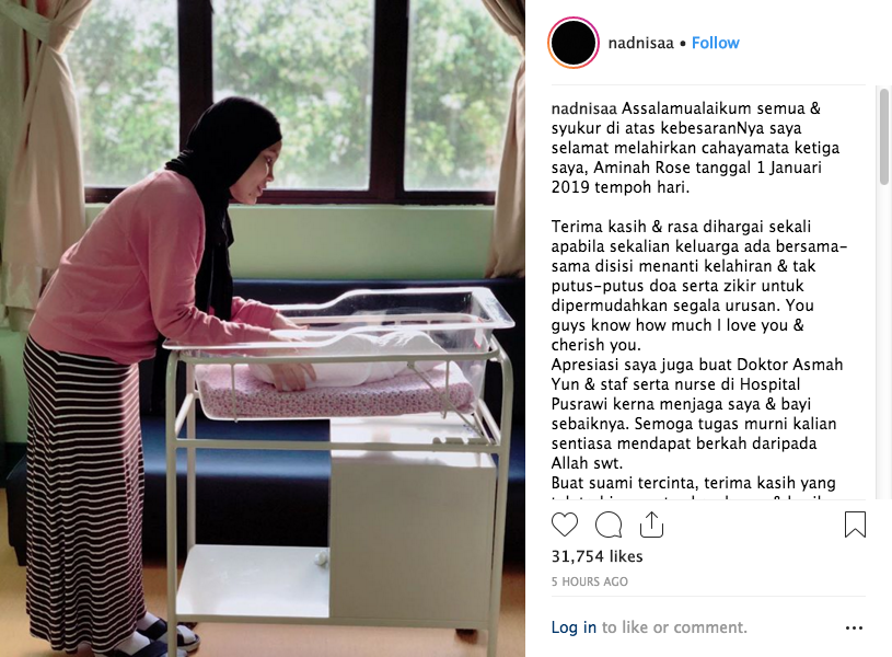 Mengumumkan berita gembira itu di Instagram, Nadiya memberitahu, dia melahirkan Aminah seberat tiga kilogram, di sebuah pusat perubatan di ibu negara pada 1 Januari lalu.
