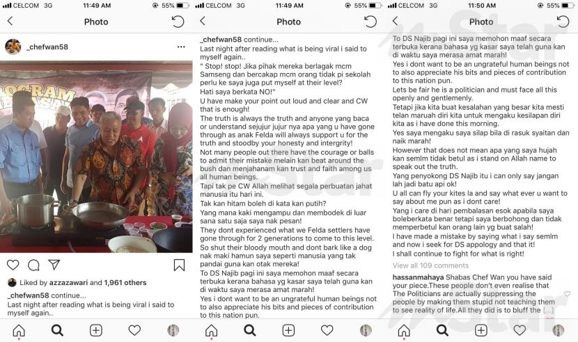 Menerusi laman Instagramnya pada Isnin, Chef Wan atau nama sebenarnya Datuk Redzuawan Ismail mengakui kenyataan itu dibuat dalam keadaan marah.