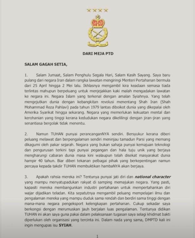 KUALA LUMPUR – Nukilan berbentuk nasihat dan puisi dipercayai hasil tulisan pemerintahan tertinggi Tentera Darat kini tular selepas dikatakan menyentuh beberapa perkara berkaitan Syiah.
