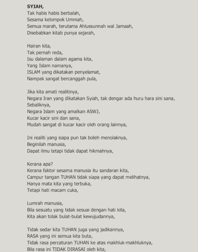 Apa yang menimbulkan persoalan adalah isi kandungan puisi bertarikh 3 Mei menyentuh Syiah yang sebelum ini telah difatwakan sesat oleh Majlis Fatwa Kebangsaan.