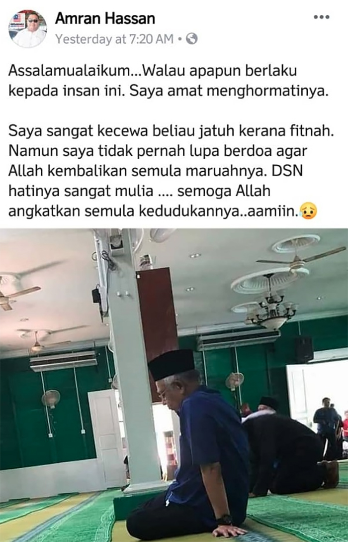 Amran menyifatkan Najib sebagai seorang insan berhati mulia dan berdoa semoga Allah mengangkat semula kedudukannya.