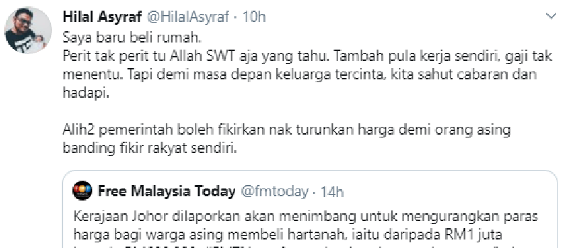 Kesal dengan kenyataan itu, Hilal memberitahu, kerajaan negeri nampaknya lebih memikirkan kesulitan orang asing berbanding keperitan hidup rakyat sendiri untuk memiliki rumah.