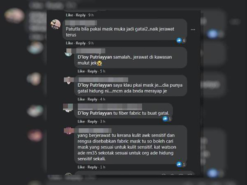 “Yang berjerawat itu kerana kulit awak sensitif dan rengsa disebabkan fabrik mask tu, jadi boleh cari mask yang sesuai untuk kulit sensitif. Dekat kedai serbaneka ada menjual RM35 sekotak sesuai untuk mereka yang mengalami masalah hidung sensitif,” ujarnya.