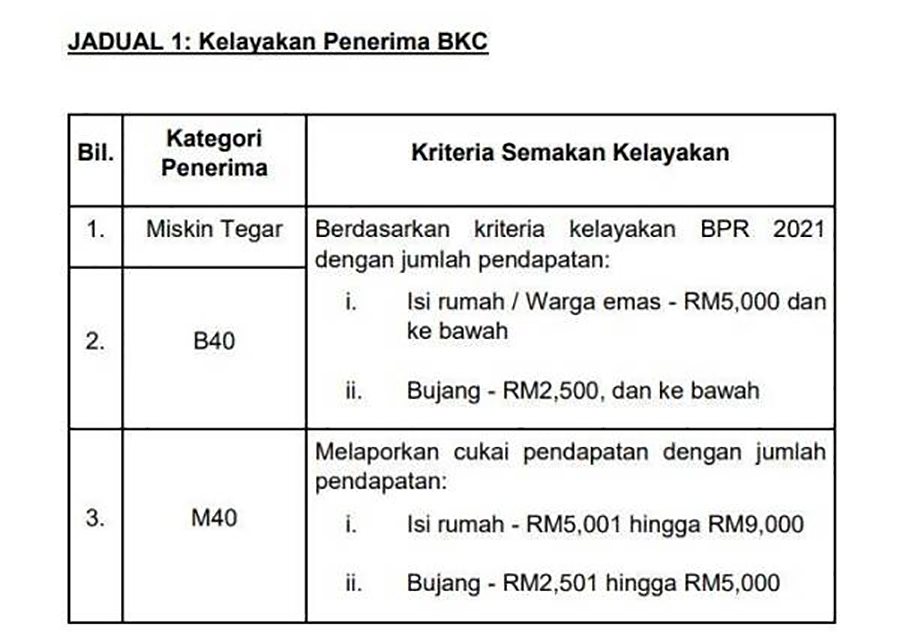 Kelayakkan menerima BKC menurut kenyataan beliau adalah seperti jadual di bawah: