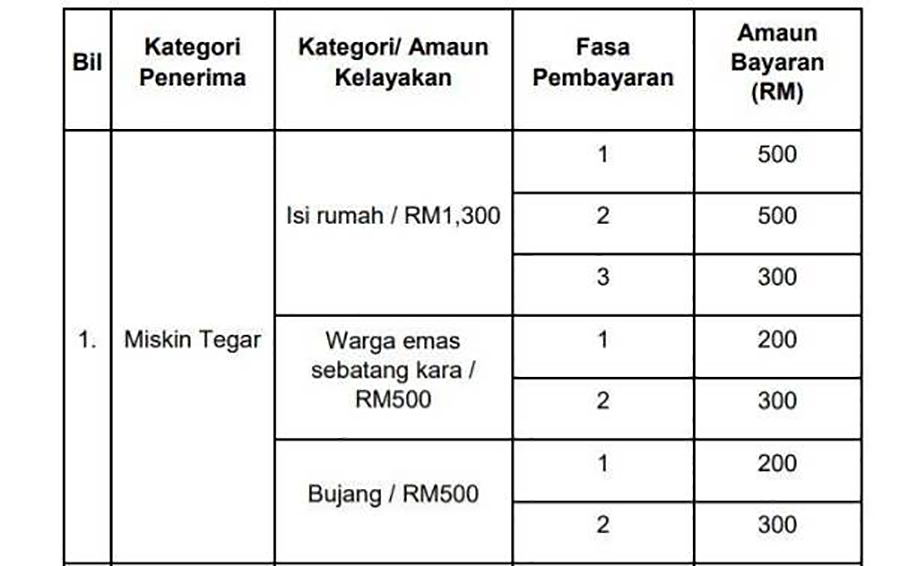 Fasa 1 pemberian itu kata beliau akan tamat pada 10 September melibatkan 10 juta penerima kategori miskin tegar, B40 dan M40.
