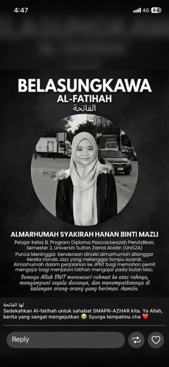 Difahamkan, Allahyarhamah sedang dalam perjalanan ke Institut Pendidikan Guru (IPG/JPN) bagi menguruskan permohonan menjalani latihan mengajar yang dijadualkan pada bulan Mac hadapan.