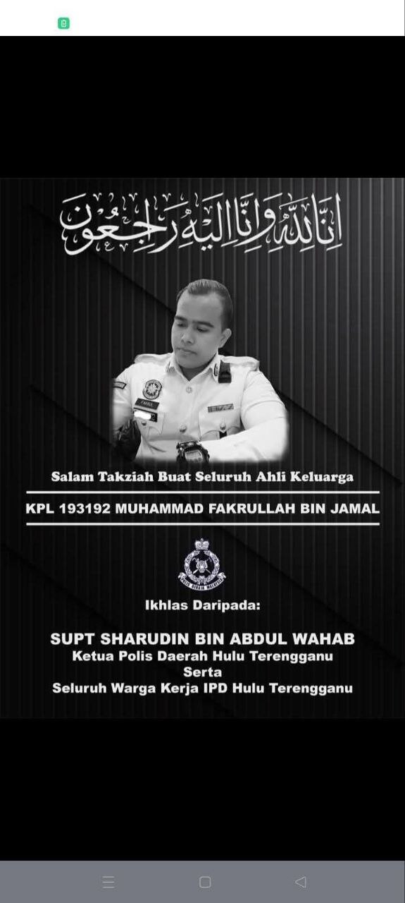 Dalam kejadian kira-kira jam 4.10 pagi di Kilometer 35 Jalan Kuala Berang – Kuala Terengganu, mangsa Koperal Muhammad Fakrullah Jamal, berusia lingkungan 30-an disahkan meninggal dunia ketika menerima rawatan di Hospital Hulu Terengganu.