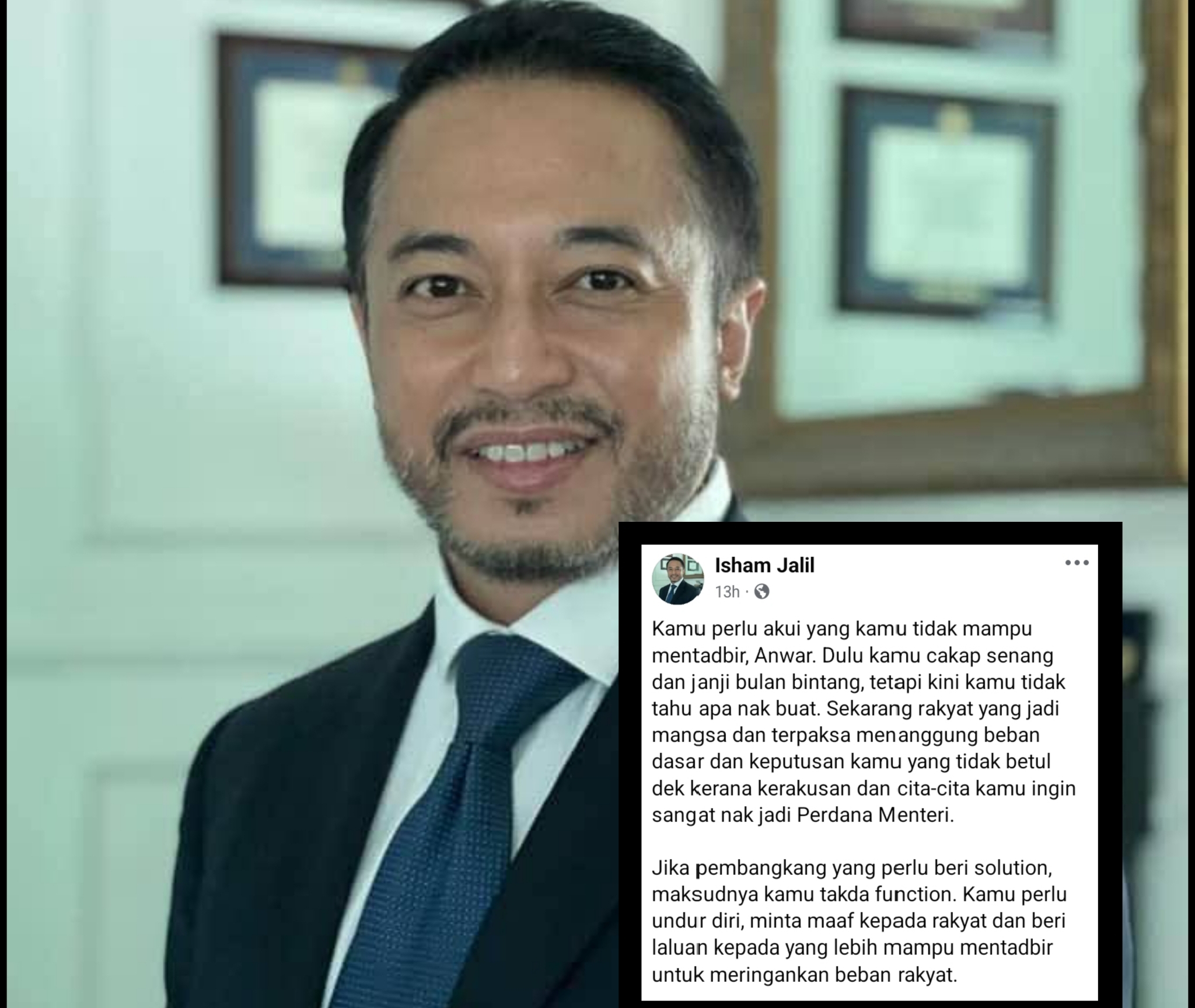 Isham dalam satu hantaran di media sosial berkata, Anwar perlu mengakui bahawa beliau tidak mampu mentadbir walau dulu membuat pelbagai janji.