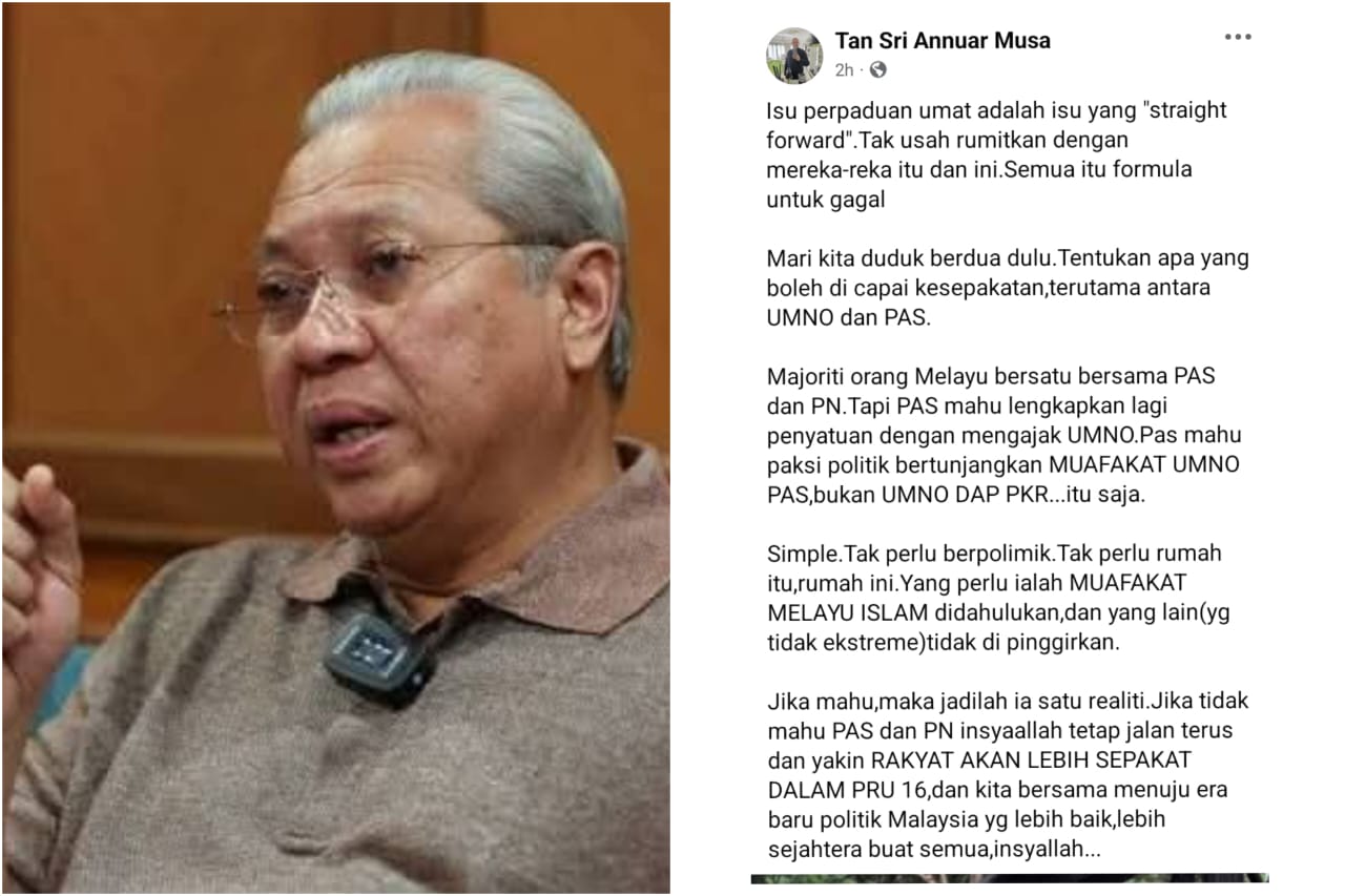“Majoriti Melayu bersatu bersama PAS dan Perikatan Nasional (PN), tapi PAS mahu lengkapkan lagi penyatuan dengan mengajak UMNO,” katanya dalam satu hantaran di media sosial hari ini.