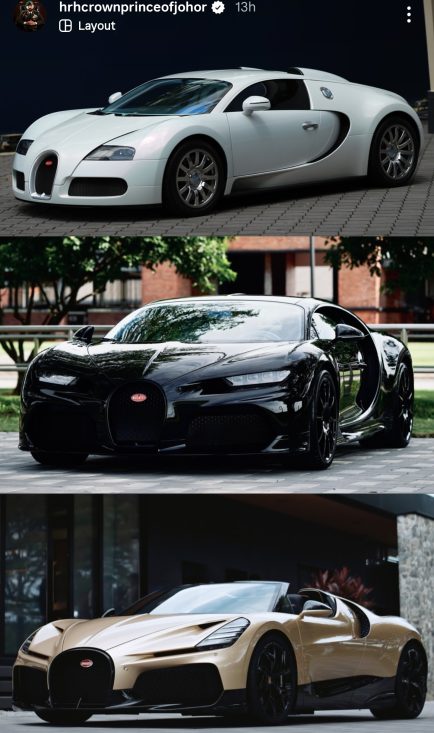 JOHOR BAHRU – Pemangku Sultan Johor, Tunku Ismail Sultan Ibrahim (TMJ) sekali lagi mencuri perhatian peminat automotif selepas memuat naik gambar beberapa buah hypercar Bugatti di akaun Instagram rasminya.