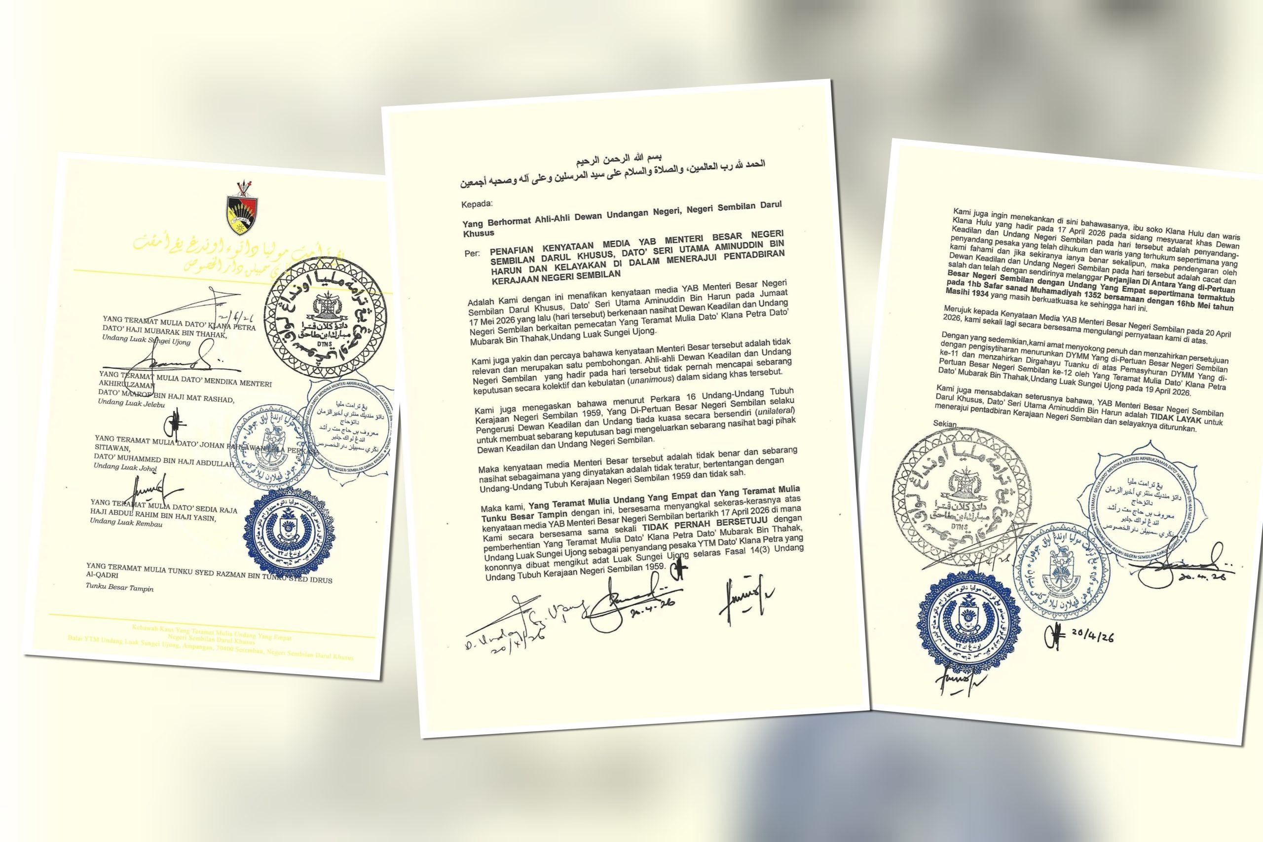 Kenyataan itu ditandatangani Undang Luak Sungei Ujong, Dato’ Klana Petra Dato’ Haji Mubarak bin Thahak; Undang Luak Jelebu, Dato’ Mendika Menteri Akhirulzaman Dato’ Maarof bin Haji Mat Rashad; Undang Luak Johol, Dato’ Johan Pahlawan Lela Perkasa Setiawan Dato’ Muhammed bin Haji Abdullah; Undang Luak Rembau, Dato’ Sedia Raja Haji Abdul Rahim bin Haji Yasin serta Tunku Besar Tampin, Tunku Syed Razman bin Tunku Syed Idrus Al-Qadri.
