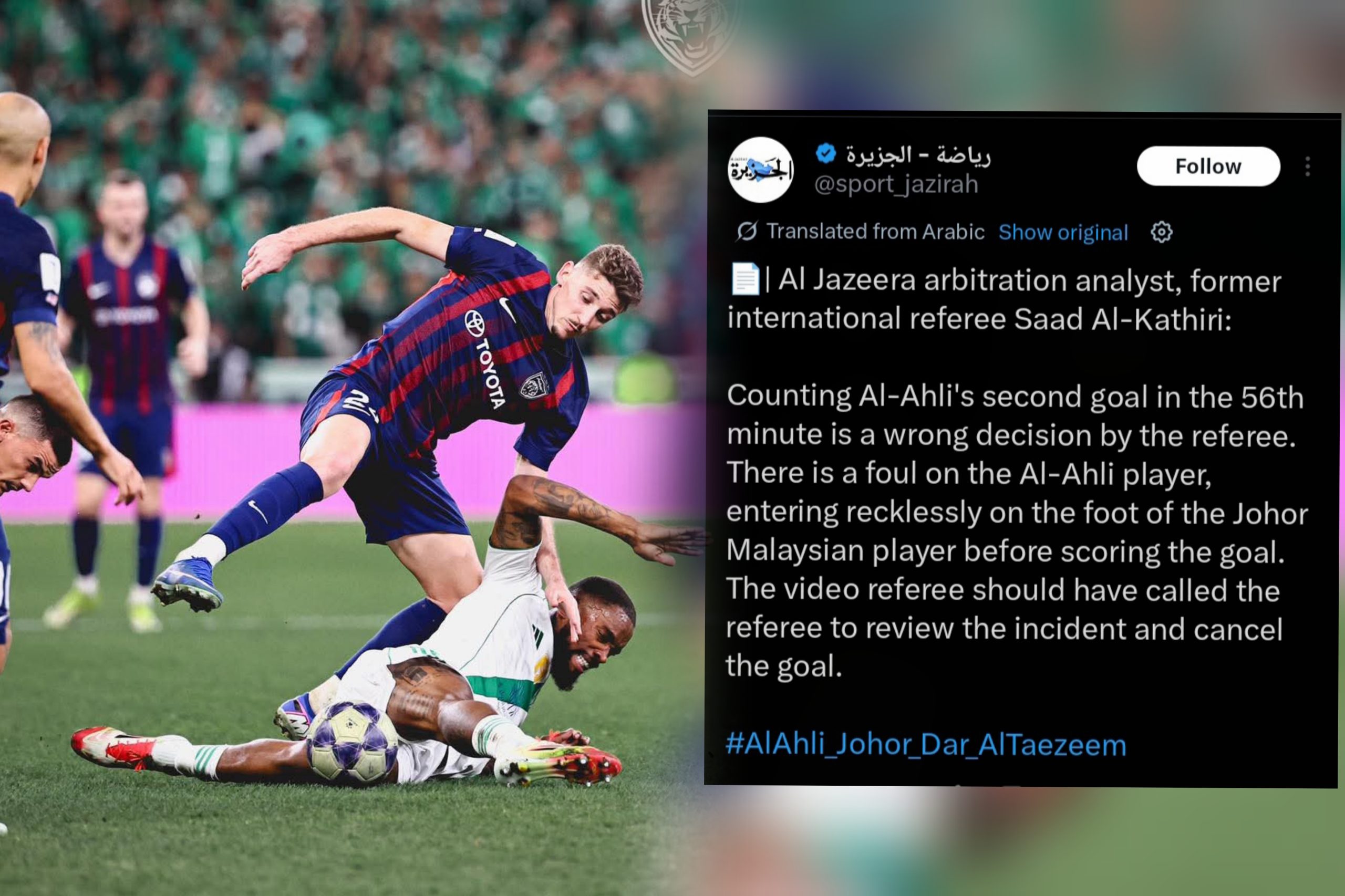 KUALA LUMPUR – Keputusan pengadil mengesahkan gol kedua Al-Ahli Saudi FC menjadi perdebatan hangat selepas penganalisis pengadilan Al Jazeera, Saad Al-Kathiri menyifatkannya sebagai satu kesilapan jelas.