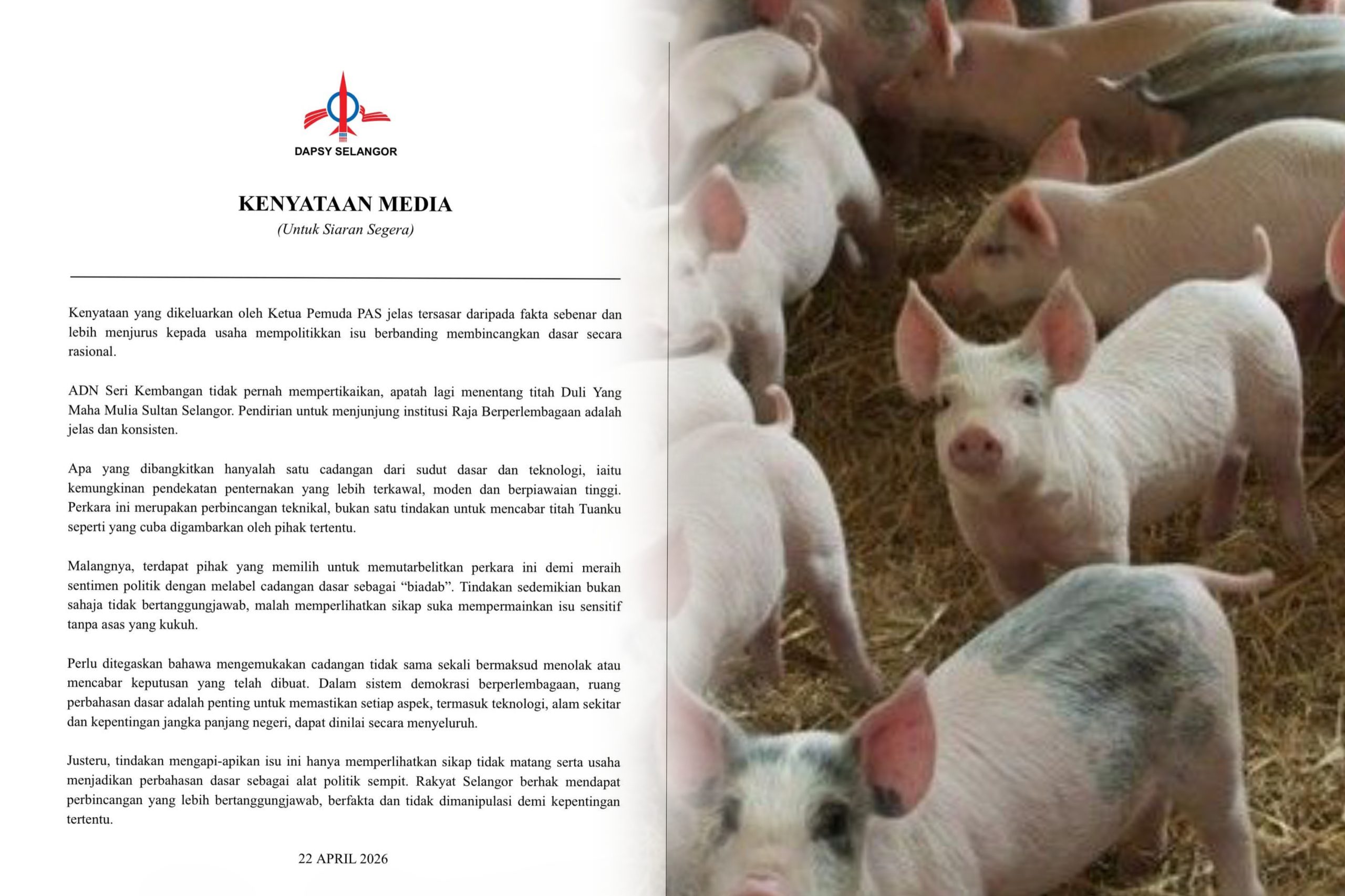KUALA LUMPUR – Pemuda Sosialis DAP (DAPSY) Selangor mendakwa kenyataan yang dikeluarkan oleh Ketua Pemuda PAS berhubung isu penternakan babi tersasar daripada fakta sebenar serta lebih menjurus kepada usaha mempolitikkan isu berbanding membincangkannya secara rasional.