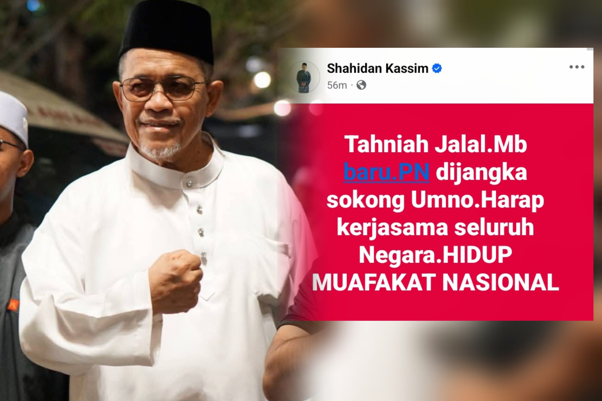 “Tahniah Jalal. MB baru. PN dijangka sokong UMNO. Harap kerjasama seluruh negara. Hidup Muafakat Nasional,” katanya.