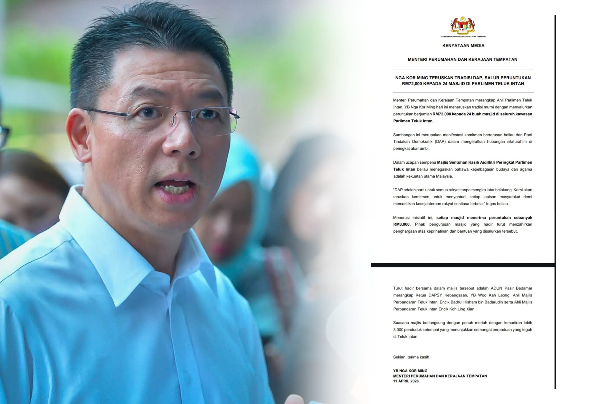 KUALA LUMPUR – Menteri Perumahan dan Kerajaan Tempatan (KPKT), Nga Kor Ming memaklumkan beliau meneruskan tradisi murni DAP dengan menyalurkan peruntukan berjumlah RM72,000 kepada 24 buah masjid di kawasan Parlimen Teluk Intan.
