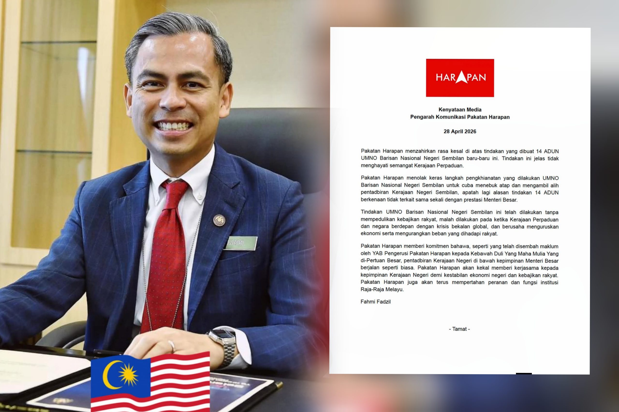 “PH menolak keras langkah pengkhianatan yang dilakukan oleh UMNO-BN Negeri Sembilan untuk cuba ‘menebuk atap’ dan mengambil alih pentadbiran kerajaan negeri, apatah lagi alasan tindakan 14 ADUN berkenaan tidak berkait sama sekali dengan prestasi Menteri Besar.