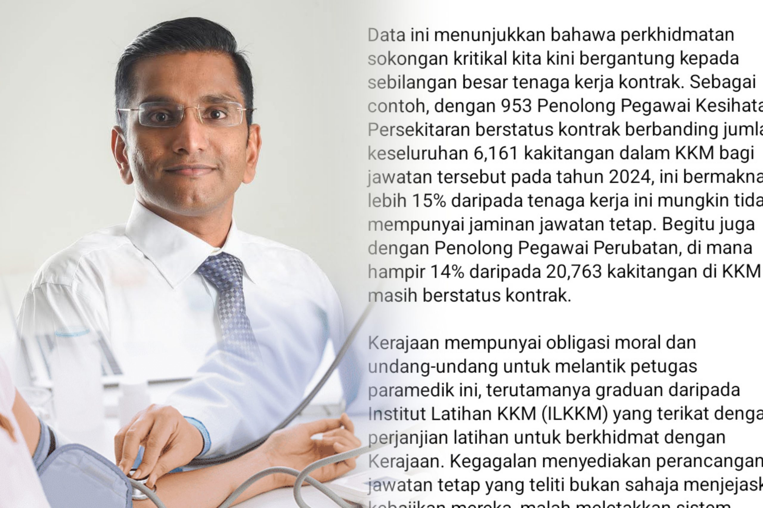 “Ini bermakna lebih 15 peratus daripada tenaga kerja ini mungkin tidak mempunyai jaminan jawatan tetap. Begitu juga Penolong Pegawai Perubatan, hampir 14 peratus daripada 20,763 kakitangan di KKM masih berstatus kontrak,” katanya dalam satu kenyataan di media sosial.