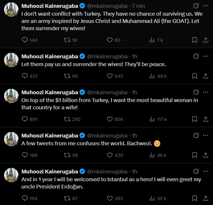Lebih mengejutkan, Muhoozi turut memberi amaran keras bahawa Uganda akan memutuskan hubungan diplomatik dengan Turki serta menutup kedutaan negara itu di Kampala dalam tempoh 30 hari sekiranya tuntutan tersebut tidak dipenuhi.