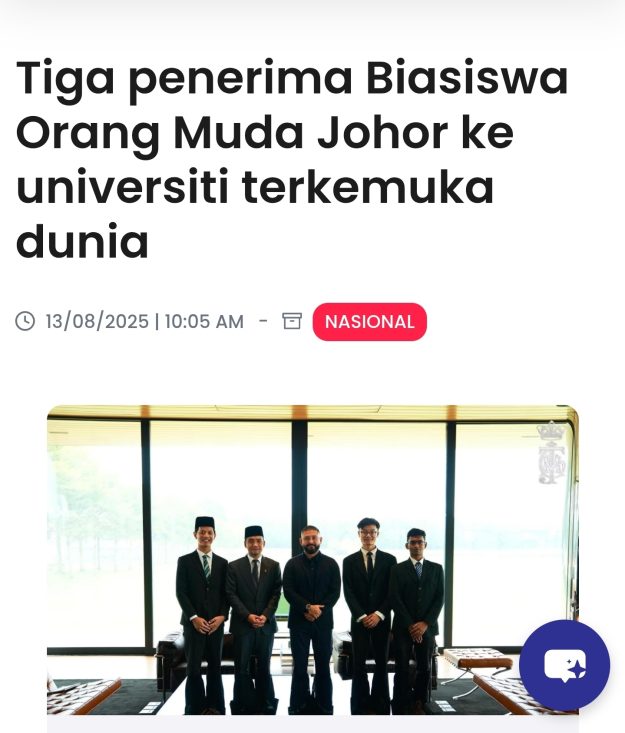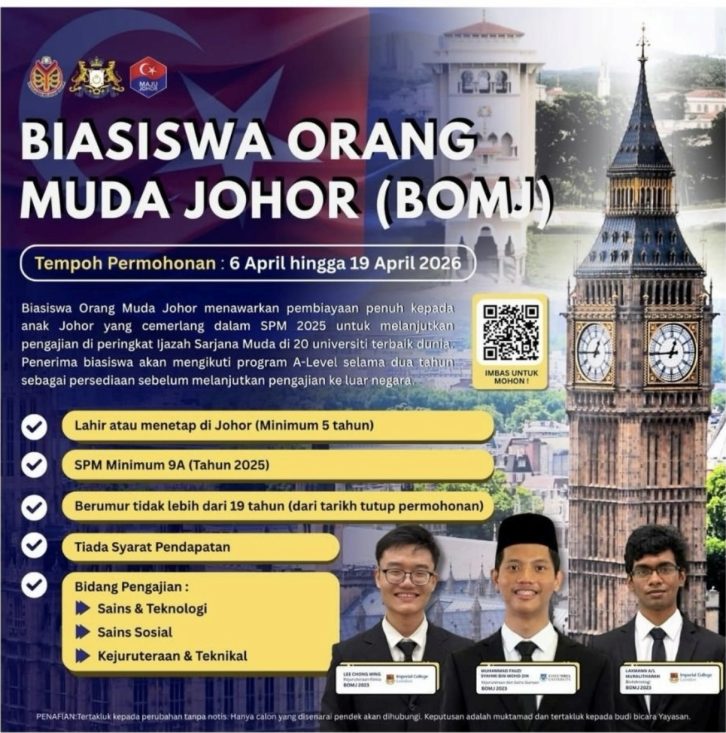 JOHOR BAHRU – Inisiatif Biasiswa Orang Muda Johor (BOMJ) terus membuktikan komitmen kerajaan negeri dalam melahirkan generasi muda bertaraf global apabila tiga pelajar cemerlang berjaya menempatkan diri di universiti terkemuka dunia.