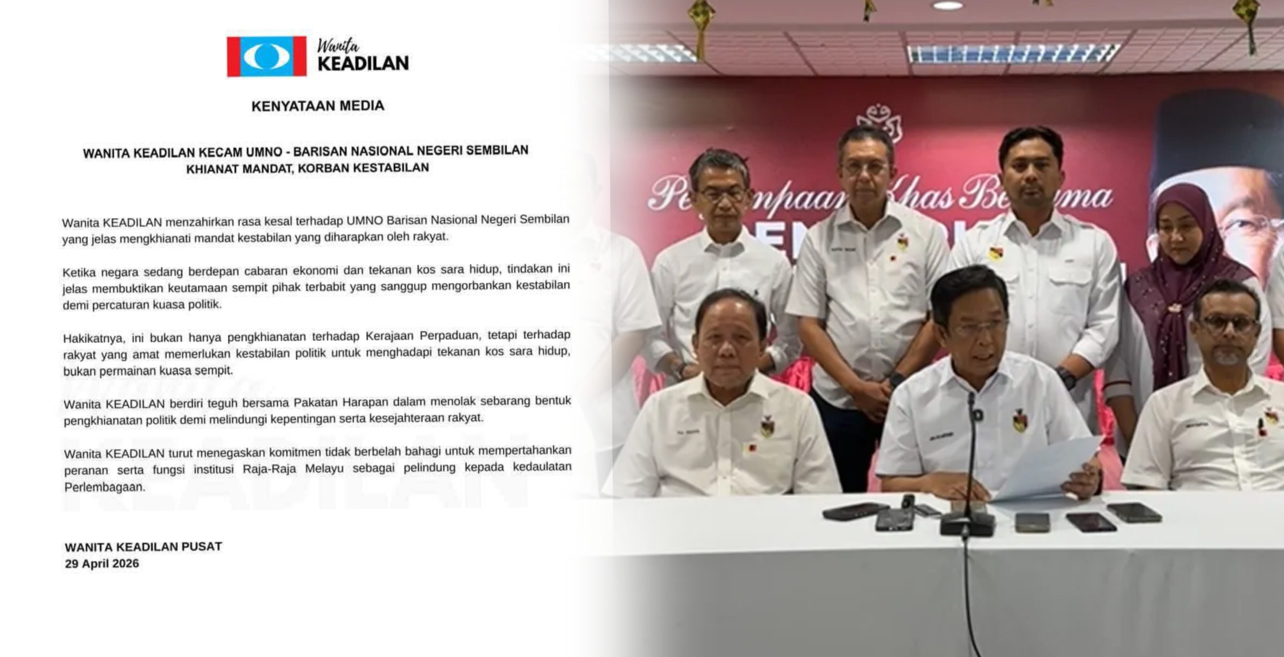 KUALA LUMPUR – Wanita Parti Keadilan Rakyat (PKR) menzahirkan rasa kesal terhadap UMNO Barisan Nasional (BN) Negeri Sembilan yang kerana didakwa mengkhianati mandat kestabilan yang diharapkan oleh rakyat.