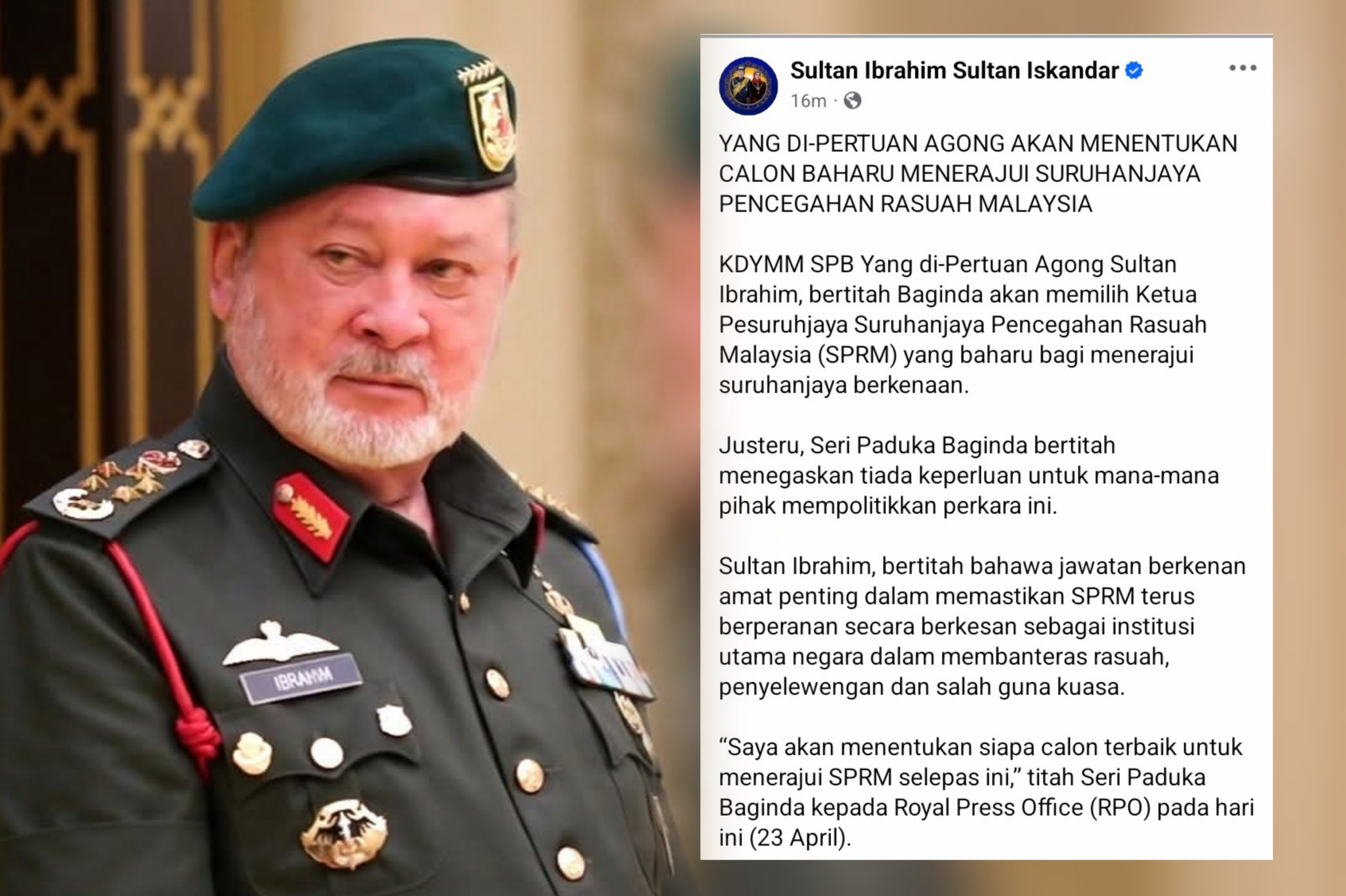 “Sultan Ibrahim, bertitah bahawa jawatan berkenan amat penting dalam memastikan SPRM terus berperanan secara berkesan sebagai institusi utama negara dalam membanteras rasuah, penyelewengan dan salah guna kuasa.